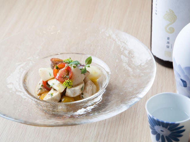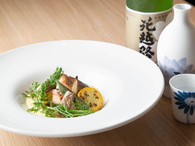 「北海道北見の蝦夷鹿で生でも良いくらいですが少し炙ってます」と熊谷シェフが教えてくれた。赤ワインとバルサミコのソース、大根おろしにミョウガ、ミツバ、ニンニク、ポン酢を和えてトッピング。おいしさに笑顔がほころぶ。あわせたのは新潟・高の井酒造の「伊乎乃(いおの)/純米吟醸」。舌の上でちょっぴりピリっとする酸の強さが蝦夷鹿の味を覆い包み込んでいく斬新なあわせ方だ。
