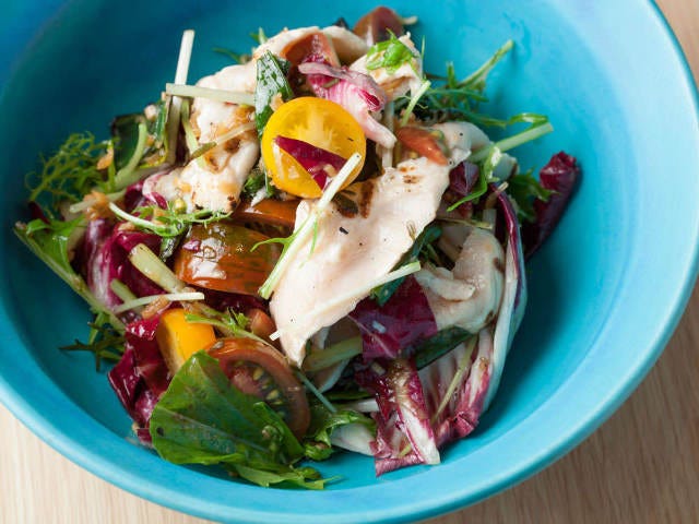 コクがあり、酸味、うまみ、辛み、深みとバランスが取れた酒だ。炭火で炙ったような香りが、焼いた九条ネギと地鶏にマッチする。それにしてもこのサラダ、九条ネギの甘みやトレビスのえぐみ、芥子菜の辛み、地鶏の香りなどいろいろな味が交錯している。