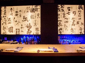 NY帰りとあってか店内はとてもスタイリッシュ。エントランスの正面には欧米人が興味をもちそうな日本酒の銘柄をデザインした大きなパネル。食器やテーブルセッティングも和を感じるモダンテイスト。ラストオーダーは午前2時。0次会から3次会まで対応でき、これはかなり重宝しそうな店だ。