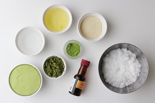 ④ ボウルにAを入れ、しっかりと角が立つまで泡立て、抹茶パウダーを入れて全体が均一に緑色になるように混ぜる。