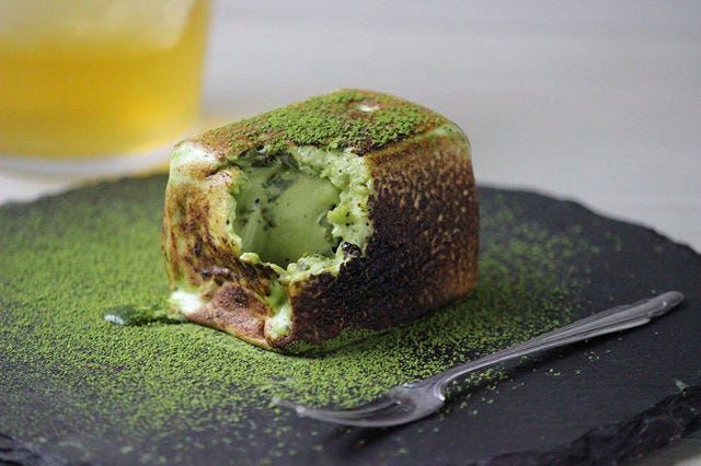 マシュマロにも盛り付けにも抹茶パウダーを使った抹茶尽くしの「抹茶スモア」。中のアイスクリームももちろん抹茶味。ほろ苦い味わいに仕上げているので、甘いモノが苦手な方にもおすすめ!