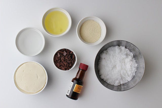 ③ アイスクリームを型の一回り小さくカットし、刻んだチョコレートをまぶして冷凍庫に入れておく。