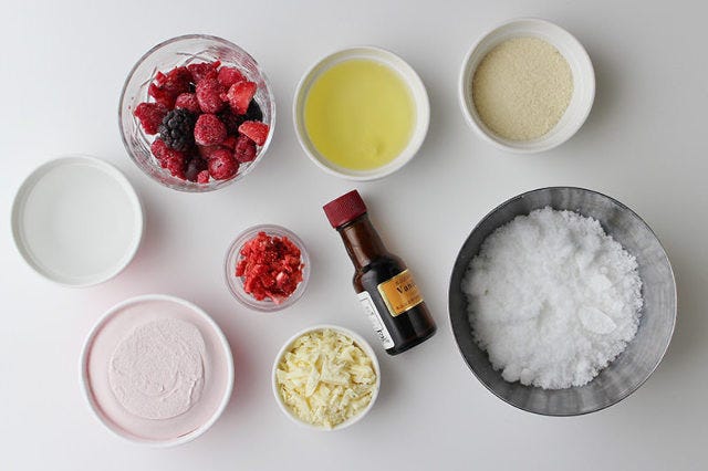 ⑧ ⑦を絞り袋に入れ、型の半分まで絞り出し、中心に③と冷凍のミックスベリーを入れ、上からアイスクリームを隠すように⑦を絞り出す。