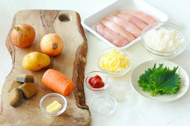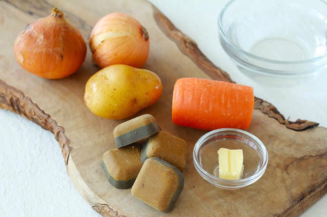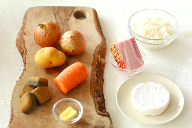 ① タマネギ1個をみじん切りにし、もう1個はすりおろす。ジャガイモとニンジンは皮をむき、乱切りにする。ブロックベーコンは1cm角に切る。カマンベールは上面を薄く切り取る。