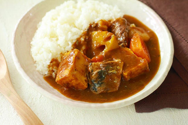 鯖の味噌煮缶を使うことで、手軽にコクと旨みをプラスすることができる。大きめにカットした厚揚げを入れることで満足感アップを狙った、ダイエット中の方にもオススメのアレンジ。レンコンのシャキシャキ食感によって、最後まで飽きずに食べられるカレーに。
