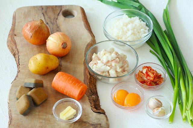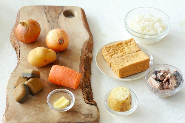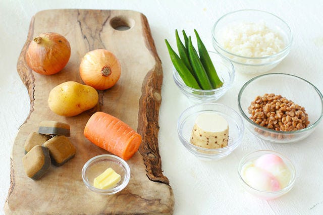 ① タマネギ1個をみじん切りにし、もう1個はすりおろす。ジャガイモとニンジンは皮をむき、乱切りにする。オクラは輪切りにする。山芋はすりおろす。納豆は付属のたれと混ぜ合わせる。