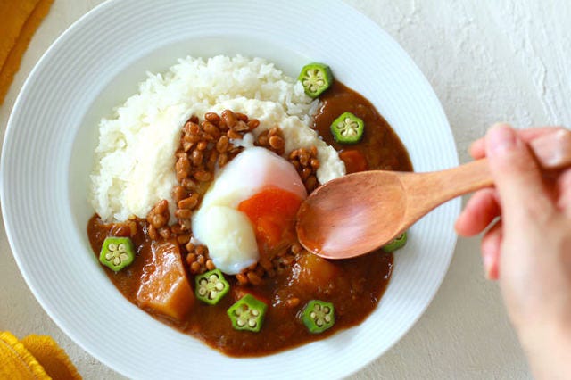 納豆やオクラ、山芋など粘り気のある食材たっぷり、最後に半熟卵をのせたネバネバ爆弾カレー。山芋やオクラに含まれるぬめり成分には胃の粘膜を保護する効果が期待できるため、カラダや内臓が疲れているときでも負担なく食べられる。カラダを気遣いながら、カレーもネバネバも楽しめるうれしいレシピ。