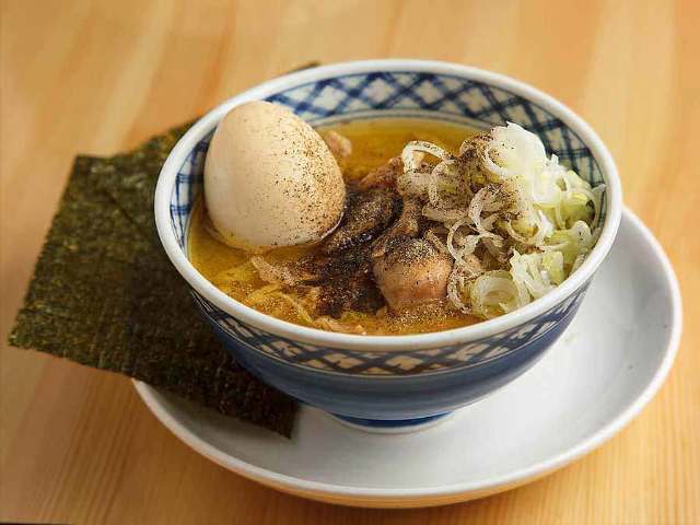 この店の煮込みはいわゆる"モツ煮"ではない。1人前分の昆布だしに、鶏もも肉を1枚放り込んだものだ。グラグラと煮立たせず、鶏のやわらかさを保ちながら1枚分にじっくり火を入れた。肉はほろりとやわらかく、スープの味もとろりと超濃厚。肉、スープそれぞれだけでも「おっ!」となるのに、両方合わせて380円とは、まったくもって東京バンザイ! しかもトッピングには半熟煮玉子も。その煮玉子トッピングも含めた本来の姿はこうなる。