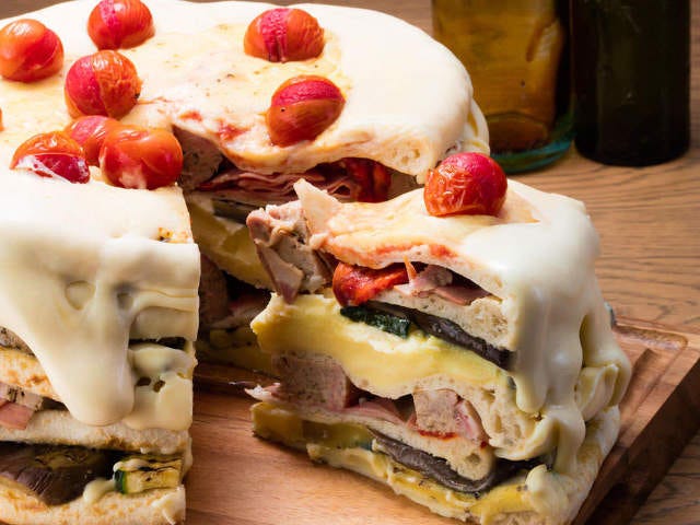 一風変わった進化系ピッツァを提供するのは『PIZZA &TAPAS cibo(ピザ&タパス チーボ)』。見た目のインパクトがスゴすぎるとウワサになっているのがピザ生地を5枚重ねたミルフィーユピッツァ。その時期の旬の野菜と、パティやハム、サラミなどのシャルキュトリーをじゃがいもペーストで重ね、とろけるチーズをたっぷりとかけたダイナミックさは半端ない! 誕生日会などでオーダーしたらテーブルが盛り上がること間違いなし。