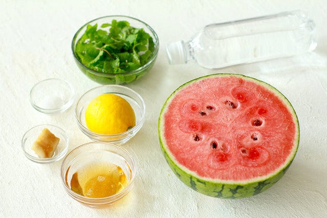 ① スイカを半分に切り、小さなアイスディッシャーで果肉をくり抜く。レモンは3mm幅の輪切りにする。生姜はすりおろして絞る。くり抜いたスイカはとっておく。