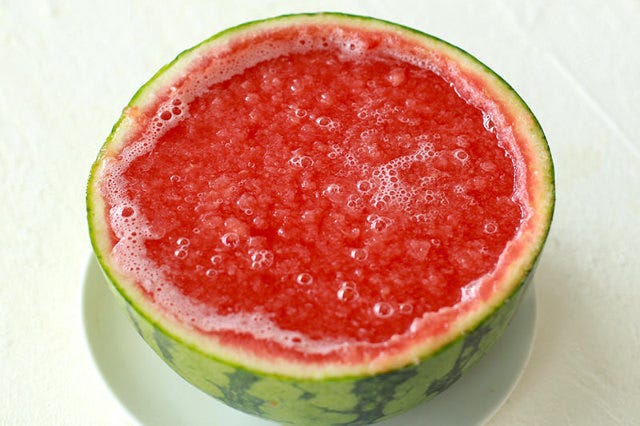 ② ①の果肉をミキサーで混ぜてなめらかにしたら①のスイカの皮に戻し入れ、フチのところギリギリまで水を加える。