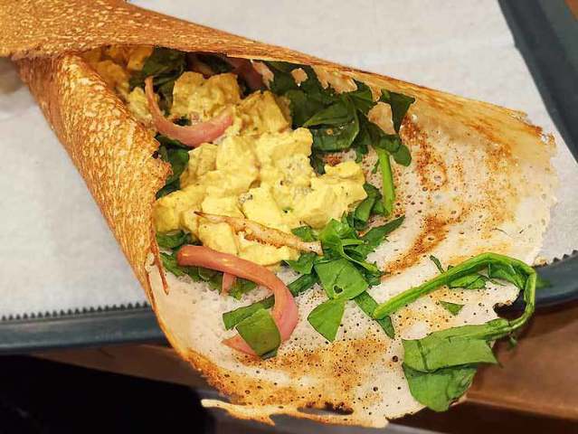 売れ筋の1つは、カレーチキンとほうれん草とローストした玉ねぎ入りのドサ。チャツネは6種類あって好みで選べるのだが、やはりマンゴーチャツネの人気が高い。