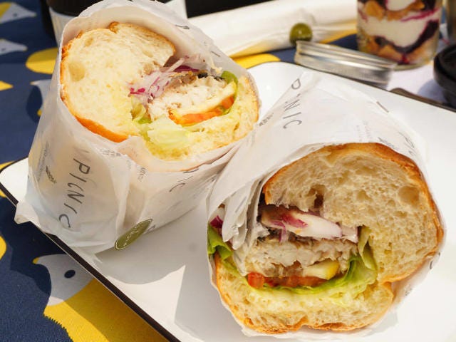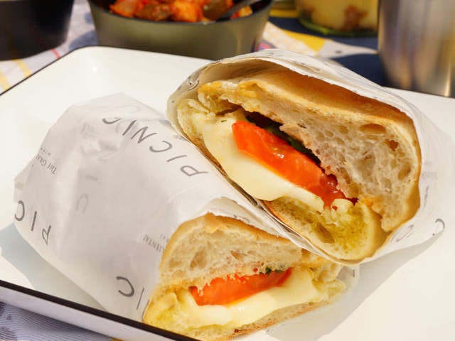 本場の雰囲気と違って、カラフルな見た目で登場。潮風と一緒に漂うエスニックな香りで、しっとり焼かれた塩サバとシャキシャキ野菜が、もちもちのバゲットに包まれていてボリューム満点! 皮ごとスライスしたレモンは、噛むと口のなかで弾ける酸味がクセになる。暑い夏にも相性がいい清涼感あるサンドウィッチは、抜群の開放感の中でいただくにぴったりな一品だ。