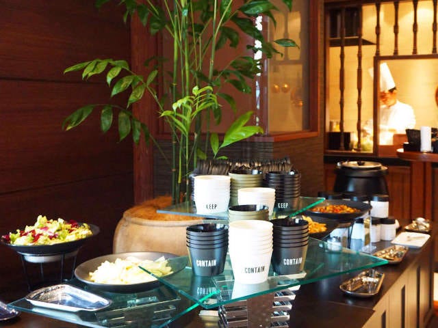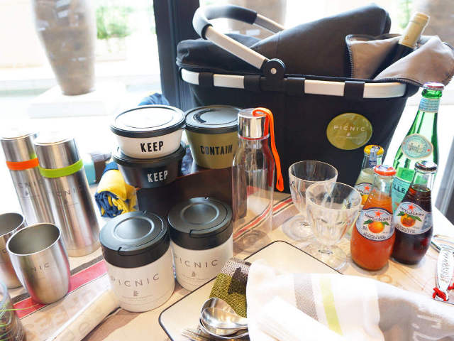ラウンジへ戻ると、オープンキッチンからいい香りが漂ってくる。ビュッフェコーナーで好みの前菜やスープをフードコンテナーによそい、あらかじめ注文していたサンドウィッチ、デザートを受け取る。フードコンテナーやマット、ピクニックプレートなどのグランピンググッズと食事を、バスケットに詰め込んだら準備完了。