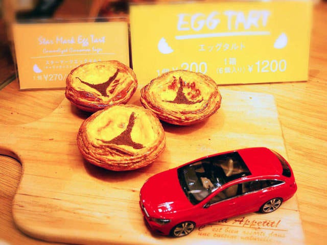 そんなエッグタルトになんと新フレーバーが登場! ブリュレしたエッグタルトの上に、シナモンと粉砂糖で描いたベンツマークが付いている。こちらも1周年記念メニューで、ベンツマーク付きドリンクと一緒に「スターマークセット」という名で提供中。