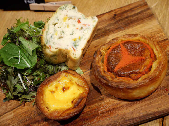 「緑のスターキッシュ&エッグタルトプレート」は、ホウレン草とパプリカが練り込まれているヘルシーメニュー。どちらのプレートもキッシュの他に、本日のケークサレ・シーザードレッシング付のサラダ・エッグタルトがセットになっており、嬉しいボリューム。こちらのプレートは16時からの限定メニューだが、「エッグタルト&キッシュセット」であればどの時間に訪れても注文することが可能。ベンツマークは描かれていないものになるが、キッシュとタルトの両方を頂くことができる。