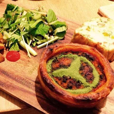 食事系メニューでイチオシなのがビタミンカラーの野菜がたっぷり詰まった自家製キッシュ。「赤のスターキッシュ&エッグタルトプレート」にはツナとトマトがたっぷり。夏らしくカレーをきかせたスパイシーテイストで、どの世代からも親しまれそうな味わい。キッシュの外側の生地はサクサクで、表面は野菜のパウダーで描かれたベンツマークが見た目も香りも印象的。