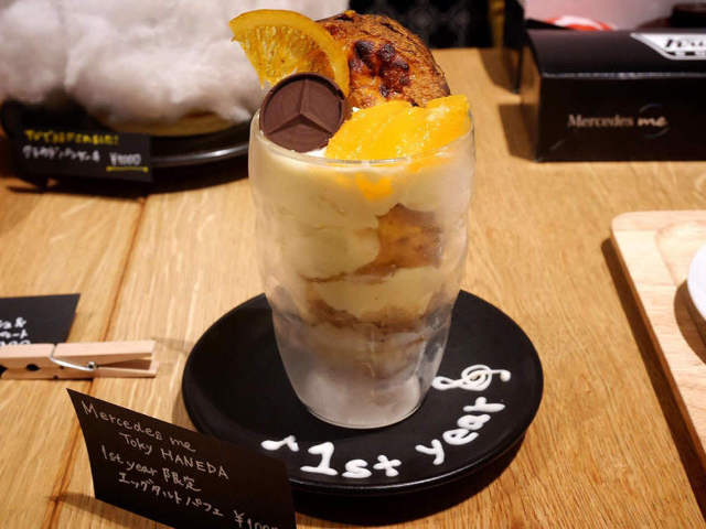 そして、衝撃を受けたのがエッグタルトを使用したパフェ「1st year限定 エッグタルトパフェ」。1番上にはハーフカットのエッグタルトとオレンジが乗せられており、グラスの中にはパイやカスタードクリーム、バニラなどエッグタルトの素材がつまっている。なんとこの1杯だけで約2個分のエッグタルトが入っているというからびっくり。1周年を記念してプレートには文字が描かれ、ベンツマークのチョコも添えられている。