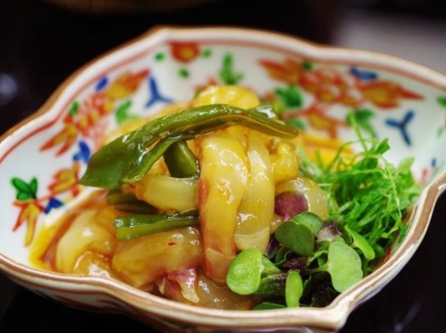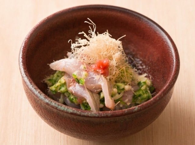 この料理は素材選びが要で、色の鮮やかな鯵とヘタの切り口が白いオクラを選ぶのがおいしくつくるコツ。色味も鮮やかで上品な一皿は、キリッと辛口の冷酒とともに粋に味わいたい。