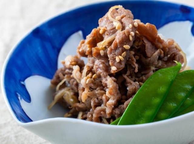②牛肉に6割程火が通ったら、醤油、砂糖、水、極細に千切りした生姜を入れ、中~弱火で5分程度煮詰める。