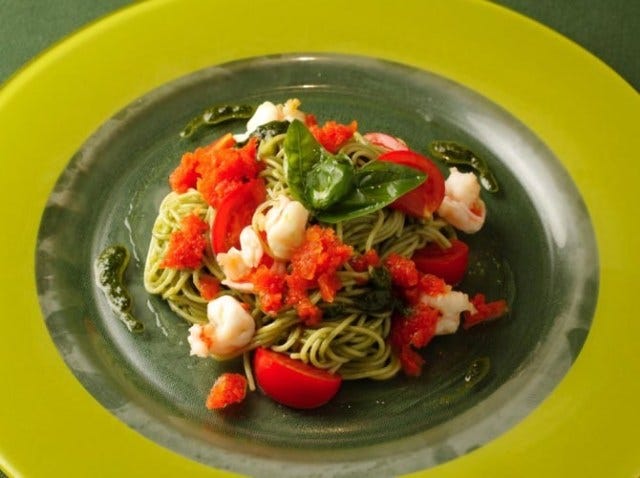 そんな香西シェフが教えてくださったのは、「バジルペーストと魚介の冷製パスタ」のレシピ。バジルペーストはバジルの量を多くするほど濃厚な味わいに。余ったペーストは清潔な瓶などに入れれば冷蔵庫で1週間から10日保存できるので、一度つくっておけば他の料理にも応用できる。