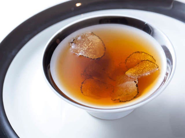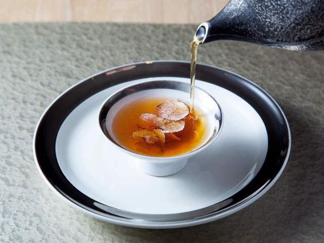 アミューズは「鹿のコンソメスープ」。ゲストの目の前で注がれる美しく澄んだ琥珀色のスープにはサマートリュフの香りがはじめに飛び込んでくる。口にした瞬間に目がキラキラと輝く。なんておいしいのだろうか。
