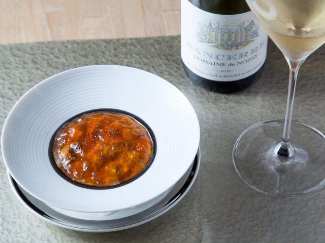前菜のひとつ「蝦夷鹿のコンソメと人参のピューレ 雲丹添え」にも震えた。雲丹は北海道の蝦夷バフンウニなので、どう考えても雲丹が主役となるはず。ところが人参の甘みと鹿のコンソメジュレの旨みが雲丹に勝とも劣らないおいしさなのである。それぞれがこれ以上ないという極上の味わいで、次は人参と雲丹、次は3つ一緒にと、どうにも止まらない。幾重にも押し寄せるおいしさの波にのみこまれていくのである。雲丹よりおいしい人参、ここにあり!