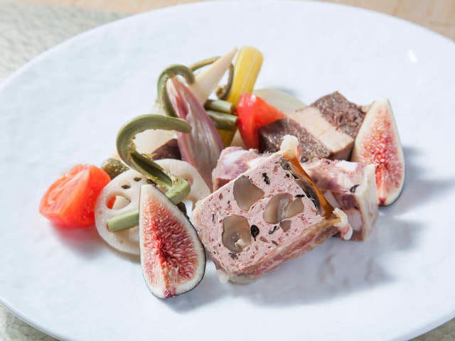 コースの中盤には代表作である3種のテリーヌが登場する。鹿100%のムースにマッシュルーム、トランペットきのこを入れ、牛バラ肉を加工したベーコンで外側を巻いた「蝦夷鹿ムース・ド・シャンピニオン」。ぶつ切りにした蝦夷鹿のハツとタンのしっかりした歯ごたえが楽しい「テリーヌ・ド・エレゾ・アバ」。そして「短角牛とフォアグラのプレッセ」は圧巻。赤ワインで煮たスネ肉を一旦バラバラにしてから固めたもので、そのほぐれ具合となめらかなフォワグラとのコンビネーション、旨みと食感のアクセントにしたくるみ、味のバランスと、他に類をみない逸品である。