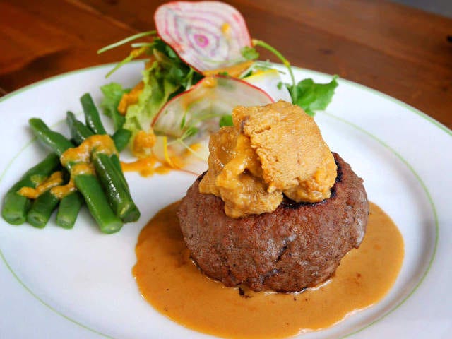 そしてなんと! ウニはハンバーグの上に乗せられているだけではない。ハンバーグの中にもたっぷりウニが詰まっているのだ。じっくり蒸し焼きにしたハンバーグの中に入ったウニは、まわりに添えられている生ウニより色味が濃くなり、黄色とオレンジの色のグラデーションも鮮やか。生ウニ・蒸しウニ・ウニソースの3つのウニの味を合わせると本当に濃厚な味わいになり、一度食べたらとりこになる人もいるだろう。