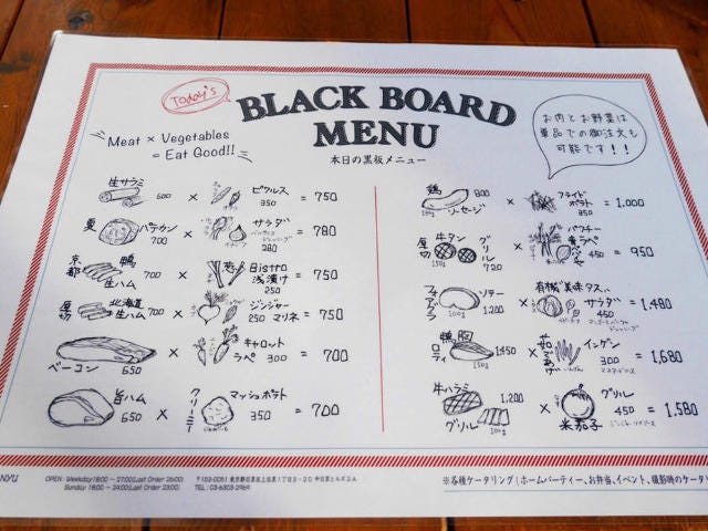 各テーブルに置いてあるメニューを見ると、全てのメニューが”肉料理×野菜料理”になっていることに気付く。この店の一番のウリである肉料理に季節の野菜を上手に組み合わせており、中でもシーズンごとに中身がかわる「パテカン(パテ ド カンパーニュ)」が人気。秋には栗入りのパテカンが登場する予定だ。