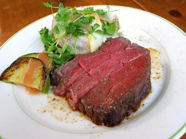 「雲丹ハンバーグ」が登場する前まで、人気ナンバー1メニューだったのが「和牛赤身肉の厚切りローストビーフ」。サイズは3段階あり、写真は一番小さ目の150g。一番大きい500gは、はじめは冗談のつもりで始めたそうだが思いのほかオーダーする人が多く、中には1人で食べきってしまう人もいるほど。