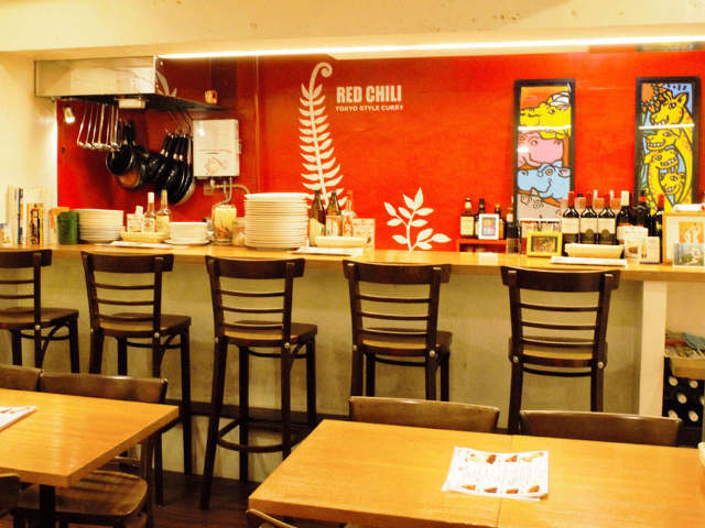 信濃町駅から徒歩5分。階段で地下に降りると、『RED CHILI』 の名にふさわしい、真っ赤な厨房が目を引く。