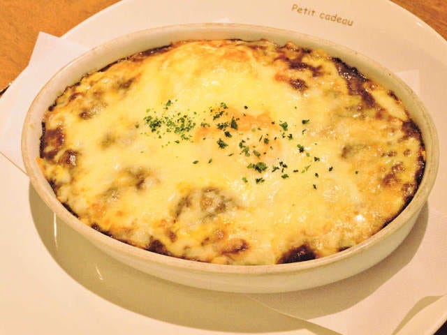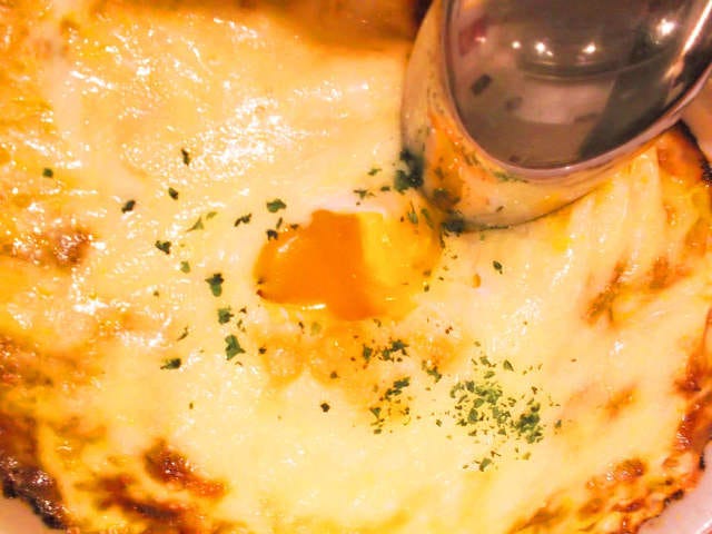 プレートだけでなく、単品のカレーも人気。おすすめはチキンカレーとのことだが、それを差し置いて人気爆発中なのが「焼きカレー」だ。焼きカレーは、単品のカレー(チキン、牛すし、ドライカレーの3種から選べる)にチーズと卵を乗せて焼いたメニュー。焼きカレーには牛すじカレーが合うということで、さっそくいただくことに。