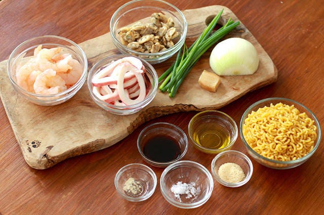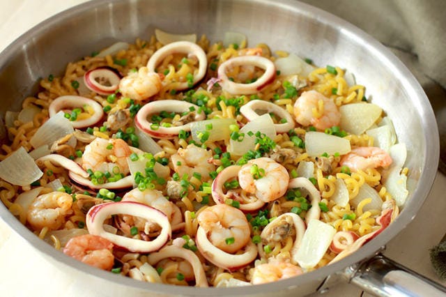 バーベキューで用意したシーフードの残りで作れる魚介パエリア。タマネギの甘みと魚介のうまみに醤油ベースのタレを加え、風味豊かな味わいに。
