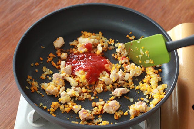 ②フライパンにバター、タマネギを入れて中火で熱し、タマネギが透き通るまで炒めたらニンジン、鶏モモ肉を加えて鶏モモ肉に火が通るまで炒め、Aを加えて水気が少なくなるまで炒める。