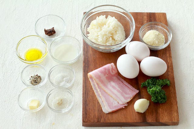 ③フライパンにオリーブオイル、ニンニクを入れて弱火で熱し、香りが立ったらベーコンを加えて脂が出るまで中火で炒める。卵、牛乳、パルメザンチーズを混ぜて加え、とろみがつくまで弱火で熱したら火を止め、塩コショウで味を調える。