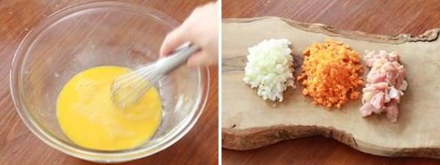 ①タマネギ、ニンジンはみじん切りする。鶏モモ肉は1cm角に切る。ボウルに卵を溶きほぐし、牛乳、塩コショウを加えて混ぜる。