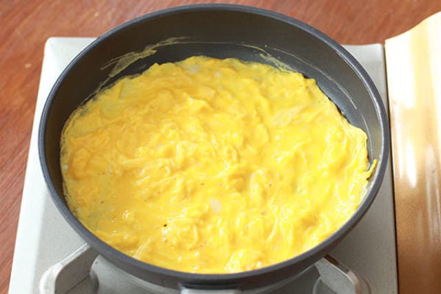 (※半熟になってからも混ぜ続けるとスクランブルエッグのようになってしまうため、半熟状になったらすぐに火を止める。)