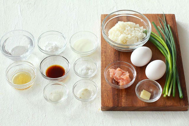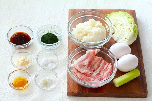 ①豚バラ薄切り肉は1cm幅に切る。キャベツ、長ネギはみじん切りする。ボウルに卵を溶きほぐし、塩コショウを加えて混ぜる。