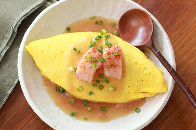 1.ご飯にも餡にもトッピングにも明太子!「明太バターの餡かけオムライス」