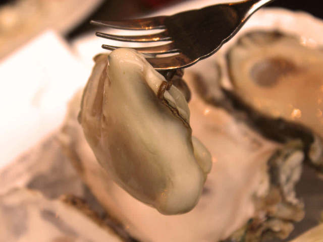 牡蠣専用のフォークでつるんと牡蠣を引き出せば、ぷるぷるのみずみずしい表面が艶めく!