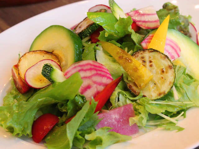 全国の有機野菜のみを取り扱う、モアーク農園の野菜だけを使っている。京都の万願寺とうがらしをはじめ、ビーツやラディッシュ、黄色ズッキーニなどの野菜がカラフルに盛りつけられている。どの野菜も甘みが強いのが特長で、シンプルにシャンパンビネガーだけで味付けし、素材の味を楽しめるようになっている。「実は女性客が過半数以上」というこちらの店の隠れ人気メニューだ。