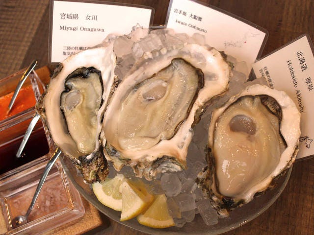 この店では、17時半から18時半までの1時間をオイスターアワーとし、1ピース290円(税抜)の特別価格で厳選された産直生牡蠣3種を楽しめる。なんとこれは平日だけでなく、週末や祝日も実施しているというのだから驚きだ。