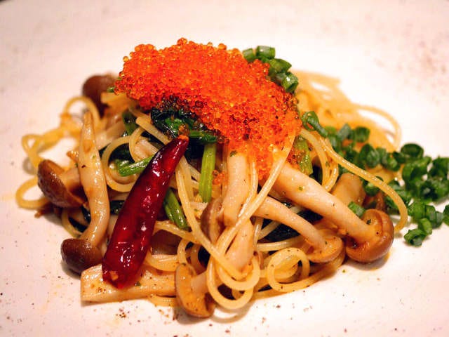 取材時は「エビージョ」の残りのオイルにマイタケやしめじなどキノコをたっぷり追加し、仕上げにトビッコをトッピングした華やかなパスタがほんの数分で完成。スペシャルサービスのパスタは、常連になって通いたくなる演出。来月からはアヒージョのバリエーションがさらに増えるそう。