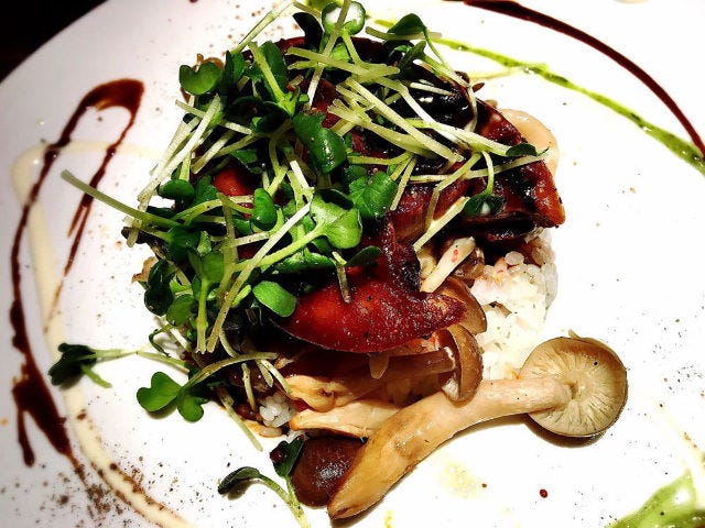 ランチの注目メニューはもうひとつある。数量限定特製ランチの「フォアグラ丼」が、なんと1,500円でいただけるのだ。フォアグラの上にカイワレやキノコが森のように盛り付けられており、一見はフォアグラの全貌がわからない。
