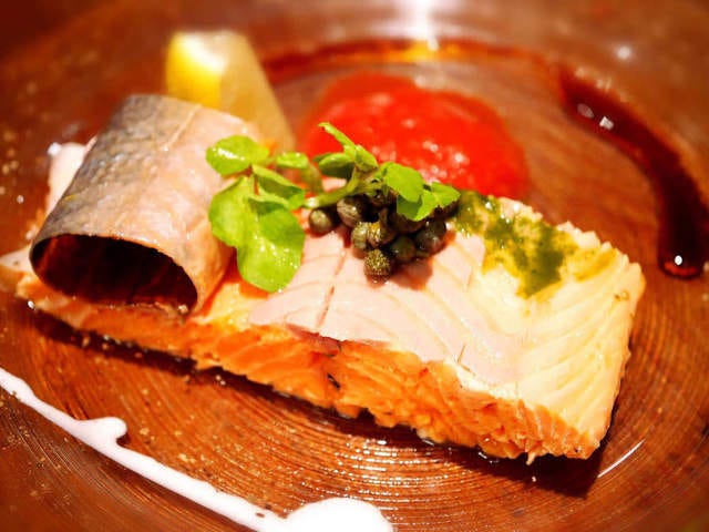 ディナーメニューのオススメは「サーモンの冷たい瞬間燻製」。塩・砂糖・ハーブで2日間マリネしたサーモンを瞬間燻製したもので、中が限りなく生に近い状態で提供される。