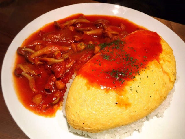 この店のランチの大人気メニューといえば「半熟オムライス」。週ごとに添えられるソースの内容が異なり、クリームソースの時もあれば、カレーやハヤシソースになることも。写真はトマトベースの「半熟オムペスカトーレ」で、キノコや魚介がどっさり入っている。