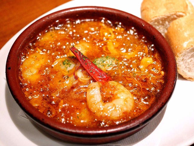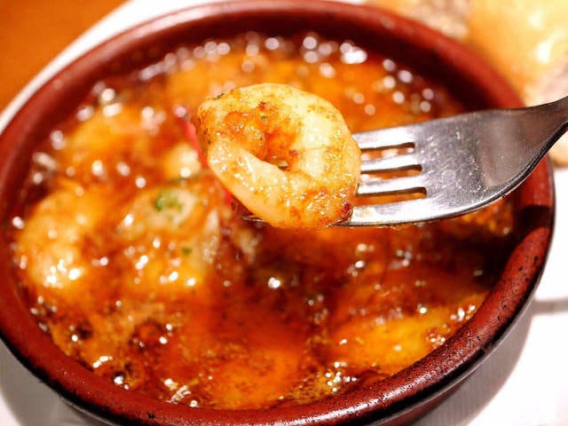 この店ではスペインバルの要素も取り入れており、スペイン料理でおなじみ「アヒージョ」のメニューも豊富に揃っている。中でも人気があるのは「エビージョ」という名のエビのアヒージョ。グツグツとおいしそうな音を立てながら運ばれてきて、早速エビにフォークを入れると、プリッとした感触が手に伝わってきた。