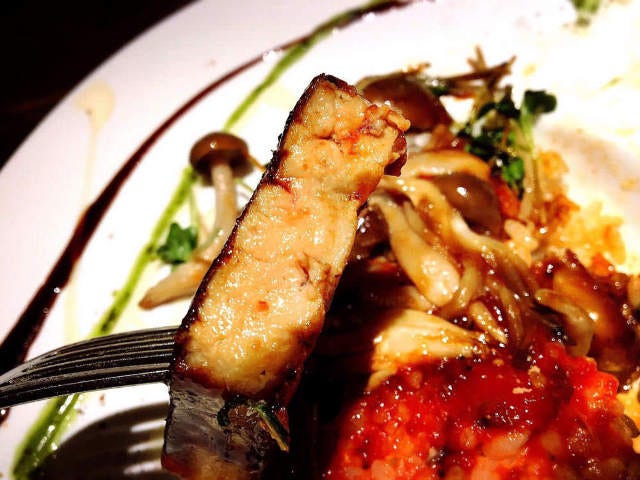 野菜をかきわけていくと、中にはこんがりと焼き色のついたフォアグラが! 火の通し方が絶妙で、とてもジューシー。2枚のフォアグラの下にはトマトソースがたっぷり。皿のまわりにはバルサミコソースがかけられているので、全体によくからめていただくとさらにおいしさが増す。