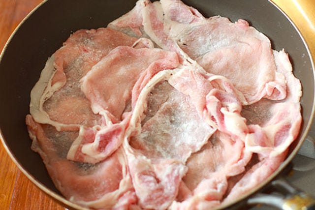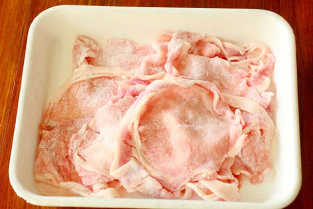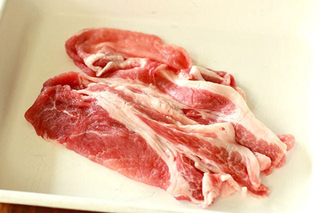 <その1>お肉は「豚ロース薄切り肉」を選ぶ。きめ細かく、柔らかな赤身の外側に脂身が程よくついているので生姜焼きにぴったり。